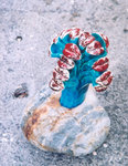 2003blauw met rode bloem op een steen.